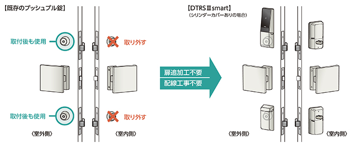 室内外のユニット、ドア開閉検知用マグネット共に扉への追加工や配線工事が不要な電池式ですので、施工費を抑えることができます。一般錠との切欠互換があるので、オプション導入も可能です。